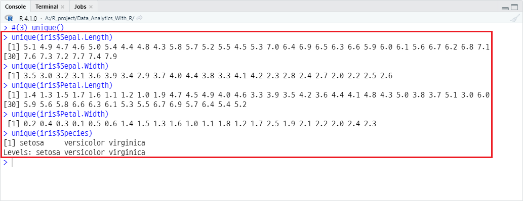 unique() 함수는 변수의 중복되지 않은 고유한 유니크값을 출력하는 함수입니다. 유니크값을 파악함으로써 데이터셋의 성격을 파악할 수 있습니다. 코드는 다음과 같은데, $(dollor sign)은 데이터셋 안에 있는 요소(변수, 컬럼)를 호출하는 구문입니다.
