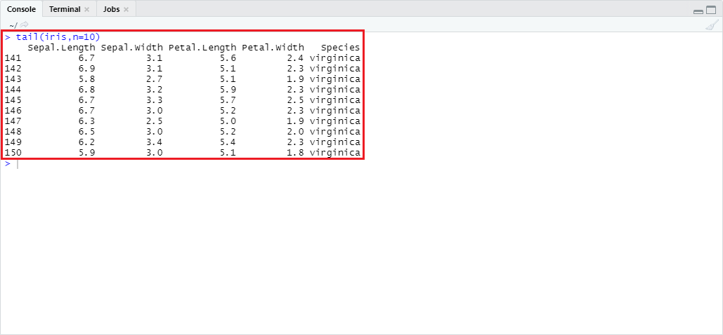 예를 들어, iris의 마지막부터 올라오는 10개의 데이터를 출력해보겠습니다.