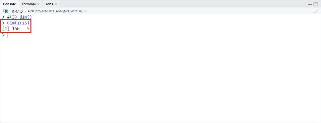dim() 함수는 데이터프레임의 차원(행∙열의 개수)을 출력하는 함수입니다. 출력할 때 첫 번째 값은 행 개수, 두 번째 값은 열을 출력합니다. dim()함수를 사용하면 결과는 같습니다.