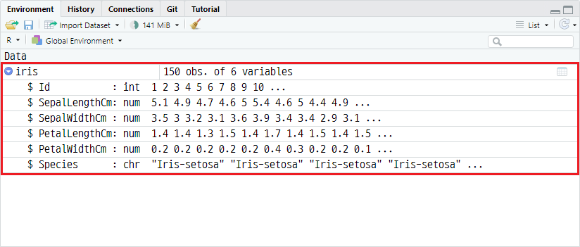 str() 함수는 R 객체에 존재하는 변수(컬럼)의 유형, 값, 구조를 요약하여 출력하는 함수입니다. 예를 들어 iris의 데이터 구조를 확인하기 위해 str() 함수를 사용하면 다음과 같습니다.