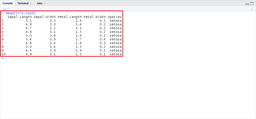 예를 들어, iris에서 첫 번째 행(혹은 레코드)부터 시작해 10개의 데이터를 출력해보겠습니다.