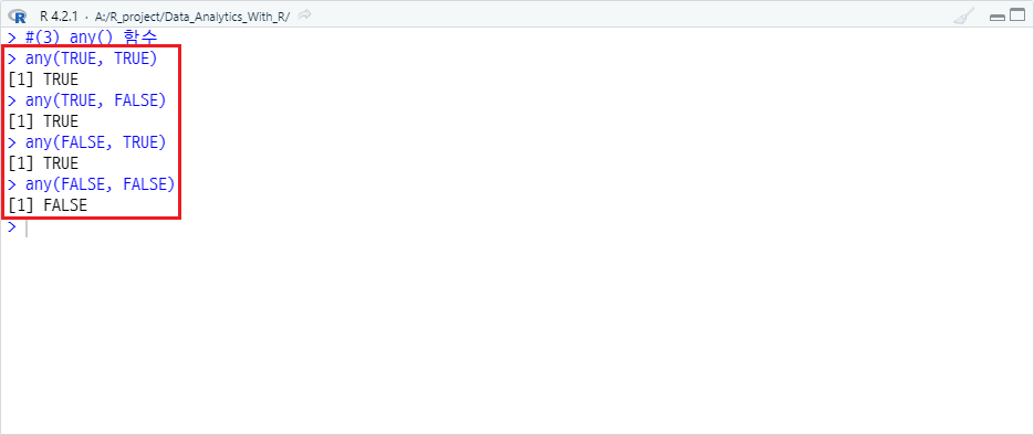 any() 함수는 벡터의 원소 중 하나라도 TRUE를 가질 경우, TRUE를 반환하는 함수입니다. 예시는 다음과 같습니다.
