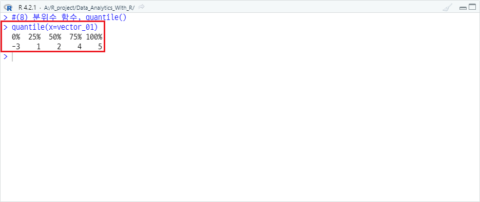 예를 들어 vector_01 객체의 각 분위수는 다음과 같습니다.