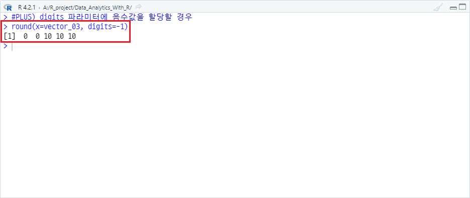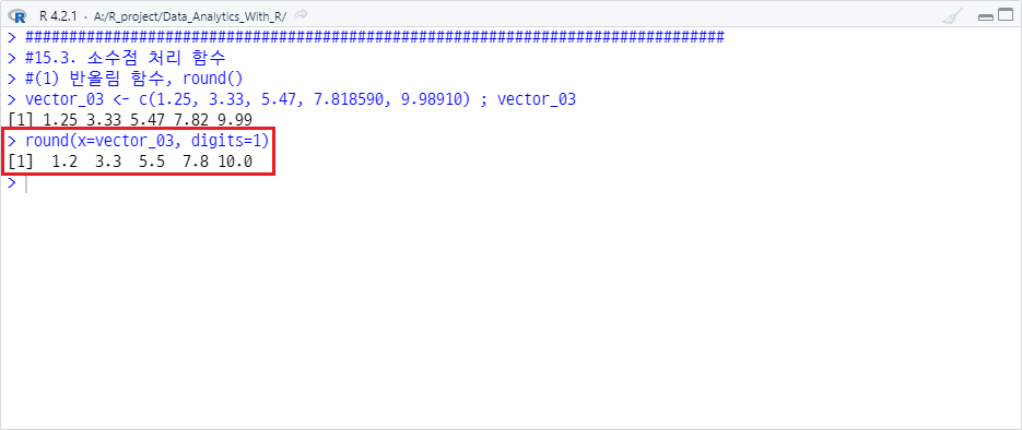 소수를 가지는 vector_03 객체에서, 소수 첫번 째 자리에서 반올림하는 예시를 들면 아래와 같습니다.