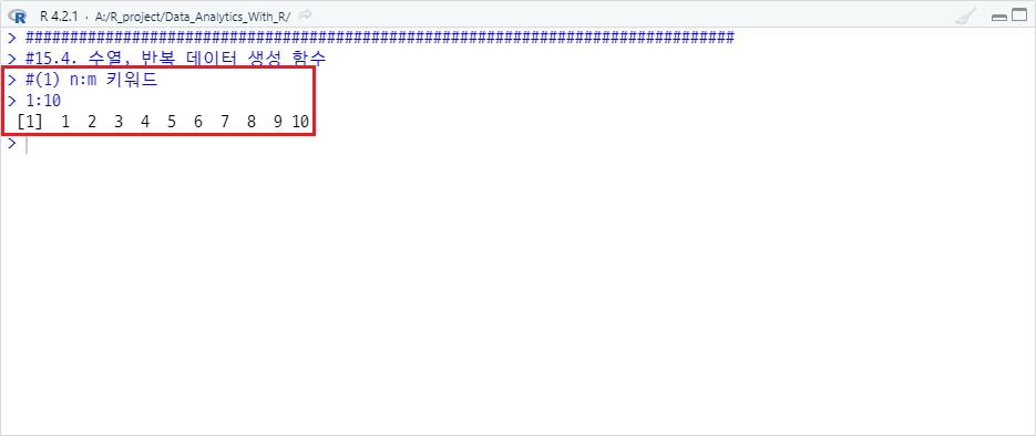 n:m 키워드는 공차가 1인 등차수열(벡터)를 출력하고자 할 때 사용합니다. 일반적인 사용 예시는 다음과 같습니다.