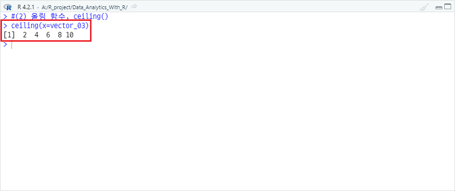 ceiling() 함수는 소수점 값을 올려 출력하는 함수입니다. vector_03 객체에서 올림을 취하면 다음과 같습니다.