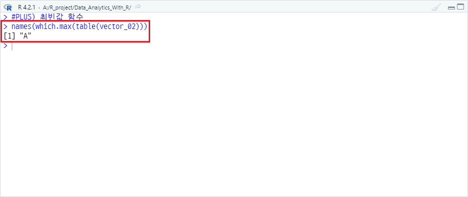최빈값이란, 데이터에서 가장 많은 빈도를 보이는 값을 의미합니다. 다만 R에서는 기본적으로 최빈값 함수를 제공하지 않습니다. 그러므로 최빈값을 구하려면 사용자가 직접 정의해야합니다. vector_02 객체의 최빈값은 다음과 같습니다.