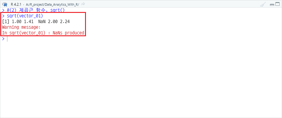 sqrt() 함수는 벡터의 각 원소에 제곱근을 취해 출력하는 함수입니다. 예를 들어 vector_01 객체에 sqrt() 함수를 취하면 다음과 같습니다.