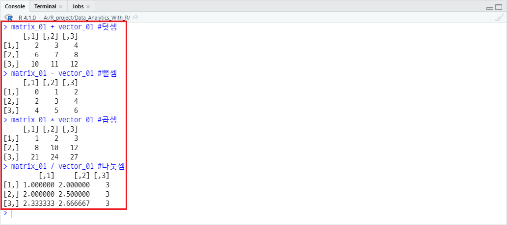 행렬과 벡터 간 연산은 재사용 규칙을 이용해 벡터의 차원을 행렬의 행에 맞추어 연산됩니다. 행렬 matrix_01과 벡터 vector_01 간 사칙연산은 다음과 같습니다.