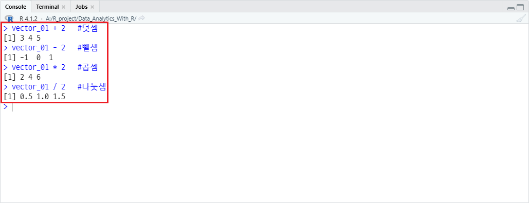 벡터와 스칼라 간 사칙연산은 일반적인 연산 기호인 +, -, *, /를 사용합니다. 원소 1, 2, 3을 가지는 1×3 vector_01 객체를 정의하고, 사칙 연산을 수행하면 다음과 같습니다.