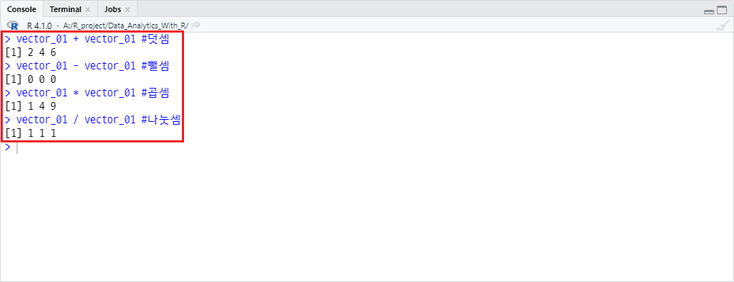 벡터와 벡터 간 사칙연산은 일반적인 연산 기호인 +, -, *, /를 사용하며, 벡터 내 원소들의 연산이 이루어집니다. vector_01 객체를 예를 들어 연산을 해보면 다음과 같습니다.