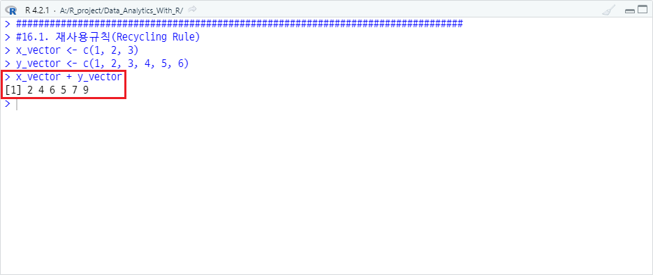 일반적으로 차원이 다른 데이터 구조 간에는 연산이 불가능한 것이 일반적입니다. 허나 R에서는 자체적으로 그 차원를 맞춰주는데, 이를 재사용 규칙이라고 정의합니다.
