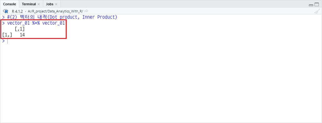 R에서 벡터의 내적을 연산하고자 할 경우, 특수 연산자인 %*%를 이용합니다. 시행 화면은 다음과 같습니다.