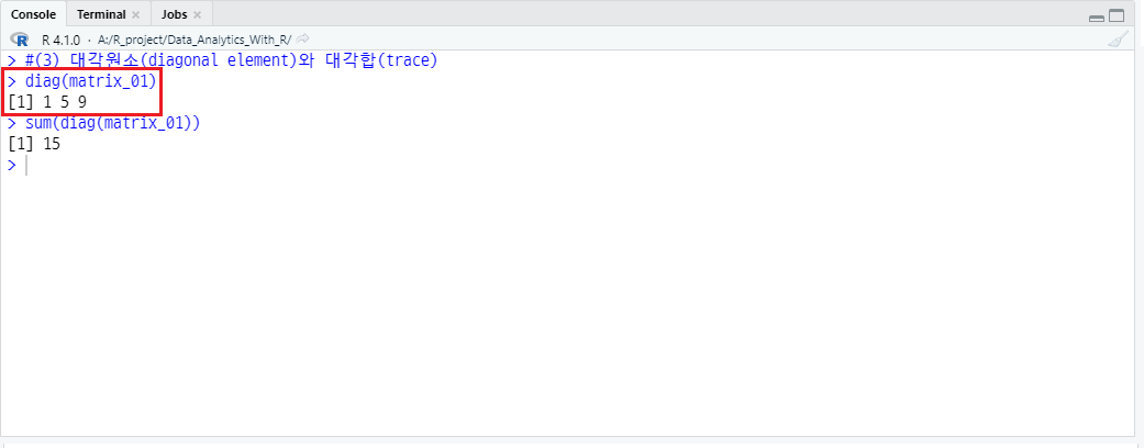 R에서는 diag() 함수를 통해 대각원소를 출력할 수 있습니다. 행렬 matrix_01의 대각원소를 출력하면 다음과 같습니다.