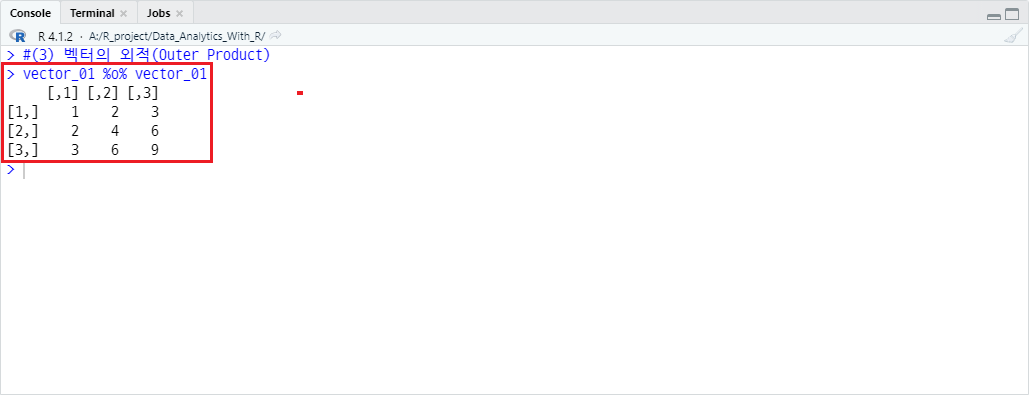 선형대수학에서 벡터의 외적이란 두 벡터의 텐서곱을 의미합니다. 수학적 정의와 이해는 <namu.wiki>를 참고하세요. R에서 벡터의 외적은 특수 연산자인 %o%를 이용해 연산할 수 있습니다. 시행 결과는 다음과 같습니다.
