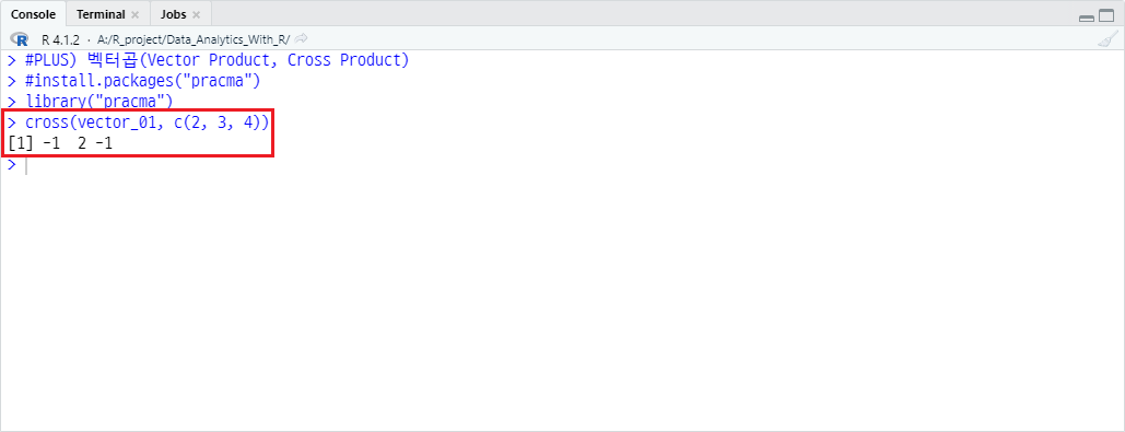 R에서는 벡터곱 연산을 지원하는 base 함수는 없지만, pracma 패키지의 cross() 함수를 통해 연산 가능합니다. pracma 패키지의 설치 및 활성화는 다음과 같습니다.