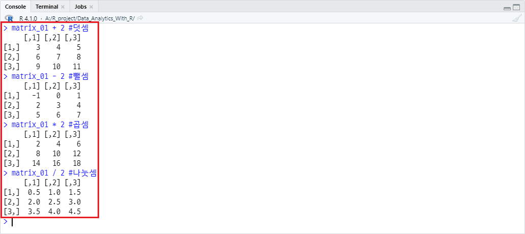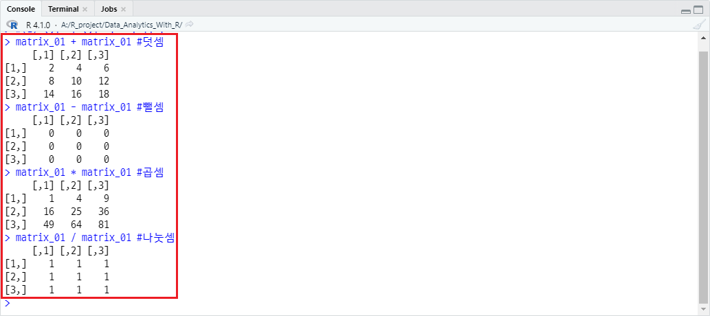 행렬과 행렬 간 사칙연산은 행렬 내 원소들이 매칭되어 연산이 이루어지므로, 행∙열의 크기가 동일해야 연산이 이루어집니다. 즉, 재사용 규칙이 적용되지 않으므로 유의해야합니다. 행렬 matrix_01을 예를 들어 사칙연산을 해보면 다음과 같습니다.