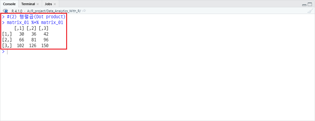 행렬곱은 특수 연산자인 %*% 기호를 사용합니다. 행렬 matrix_01을 이용해 연산해보면 다음과 같습니다.