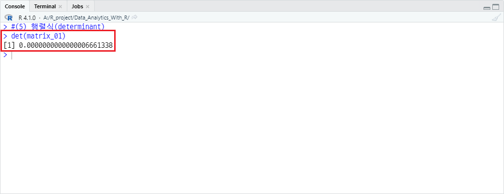 행렬식이란 정방행렬의 가역성, 역행렬의 존재 유무를 판별하는 값입니다. det() 함수를 통해 행렬식을 구할 수 있는데, 코드는 다음과 같습니다.