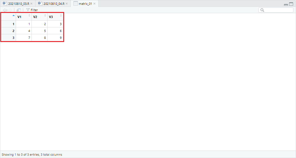 행렬과 스칼라 간 연산은 재사용규칙을 이용하여 연산 처리됩니다. 예를 들어 1에서 9까지의 정수로 이루어진 3×3 행렬 matrix_01객체를 정의해보겠습니다.