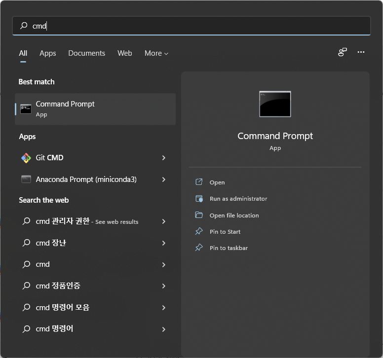 (1) 좌측 하단의 돋보기 버튼을 클릭 후, "cmd"라고 검색합니다.