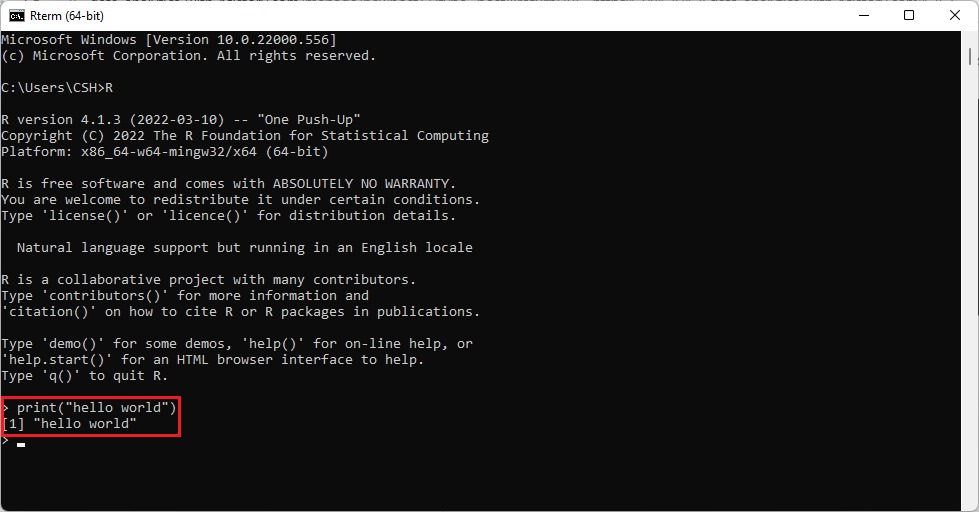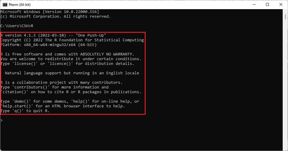 (2) cmd command에 R이라고 입력합니다. 환경 변수가 제대로 인식됐다면, 결과는 아래와 같습니다.