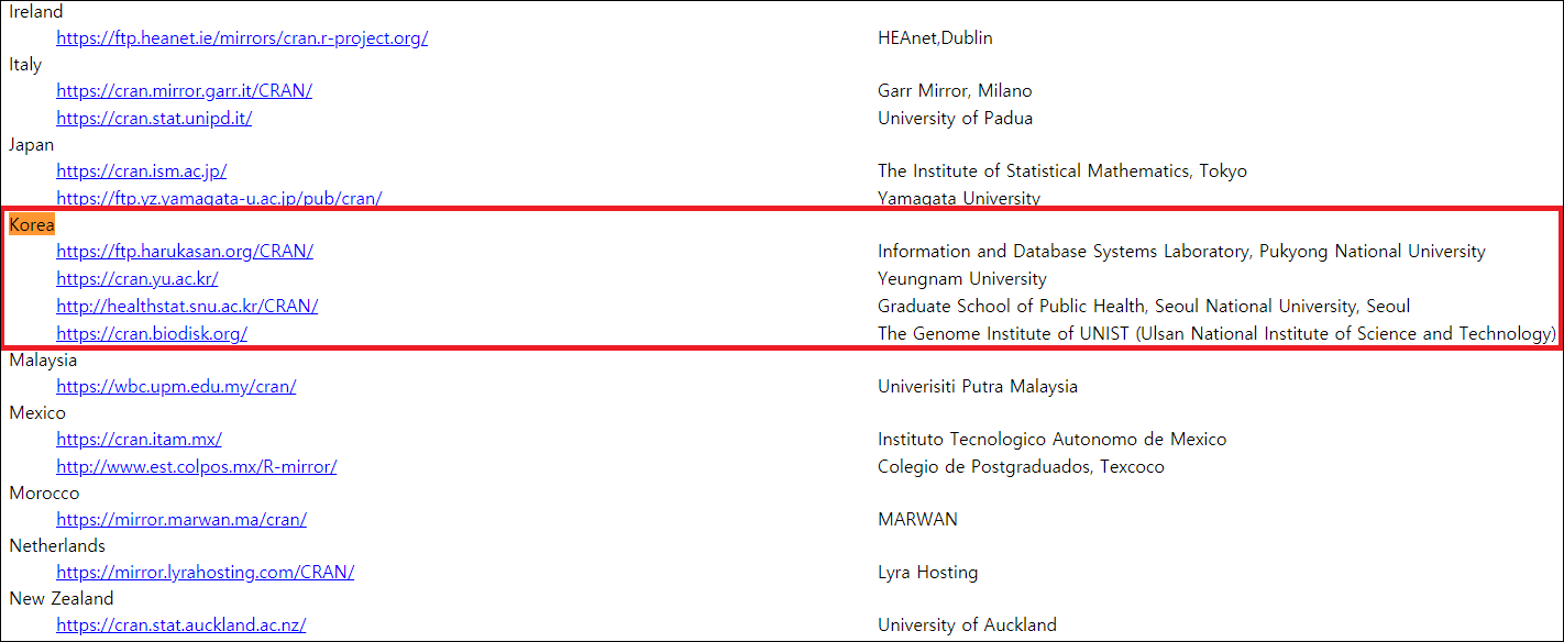 (2) CRAN을 클릭하면 아카이브 목록이 뜨는데, 'KOREA' 항목에 해당하는 링크를 클릭합니다.