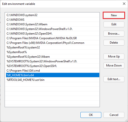 (6) [New]버튼을 클릭하고, 경로를 "%R_HOME%\bin\x64"으로 지정합니다.