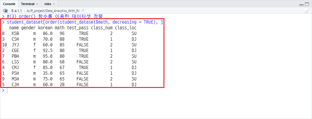 order() 함수의 주로 인덱싱을 이용하여 데이터셋을 정렬하고자할 때 사용합니다. 사용 방법은 아래와 같은데, 수학점수를 기준으로 내림차순한 데이터셋을 반환하고자 할 경우 다음과 같습니다.