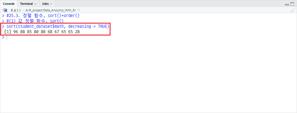 sort() 함수는 벡터 구조의 원소들의 값을 정렬하는 함수입니다. decreasing 파라미터를 통해 내림차순처리할 수 있습니다. 예를 들어 student_dataset의 수학점수를 기준으로 내림차순 정렬하고자 할 경우 다음과 같습니다.