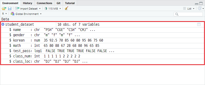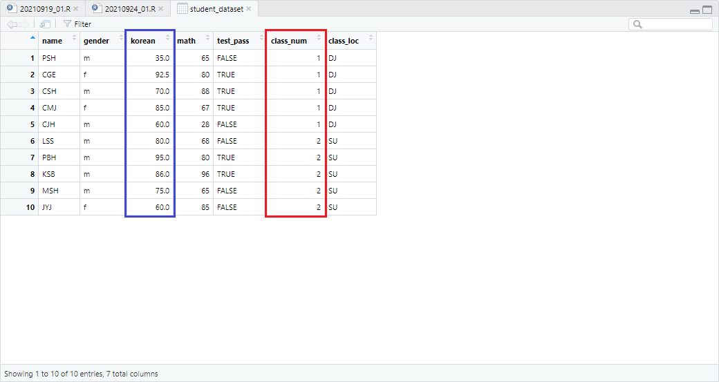 예시를 위해 이전 포스트인 <24. 데이터셋 결합하기>에서 1반, 2반 학생의 정보를 결합한 student_dataset을 다시 사용하는 과정은 다음과 같습니다.