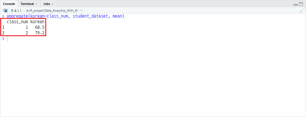 반 번호(class_num)을 기준으로, 국어 점수(korean)의 평균을 그룹핑하고자 하는 과정은 다음과 같습니다. 먼저 해당 변수들의 관계를 빨간, 파란색 박스를 통해 확인하면 다음과 같습니다.