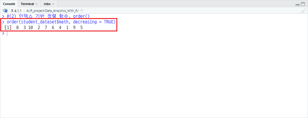 order() 함수는 sort() 함수와 비슷하지만, 값이 아닌 인덱스를 반환하는 함수입니다. 위의 예시와 동일하게 수학점수를 기준으로 내림차순한 인덱스를 확인하고자할 경우 다음과 같습니다.