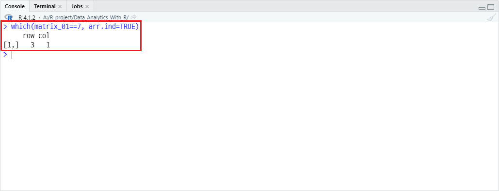 반환값은 3인데, R은 기본적으로 열을 기준으로 index를 설정하기 때문입니다. 여기서 arr.ind 파라미터를 TRUE로 설정할 시의 결과는 다음과 같습니다.