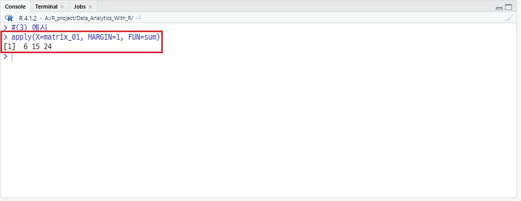 위의 matrix_01 객체에서 행 기준으로 모두 더하고자 할 경우, 코드는 다음과 같습니다.