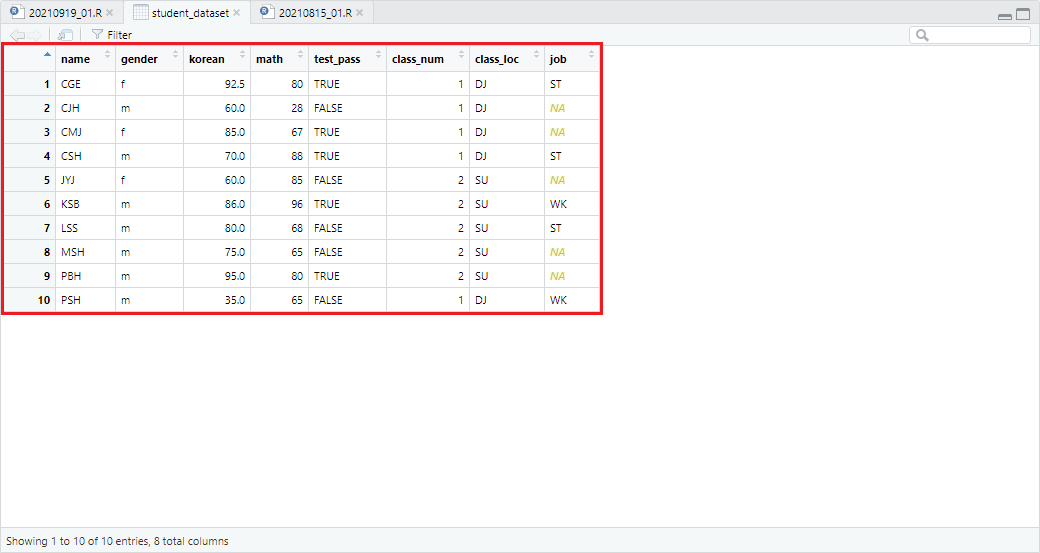 처리 결과 job_info_dataset에 명시되지 않은 학생들은 NA(결측치) 처리됨을 확인할 수 있습니다.