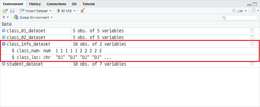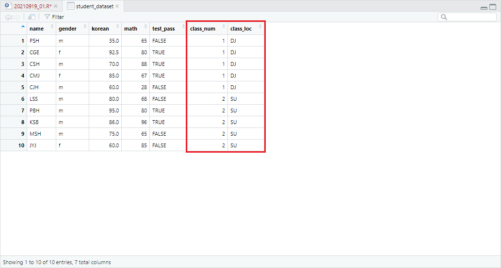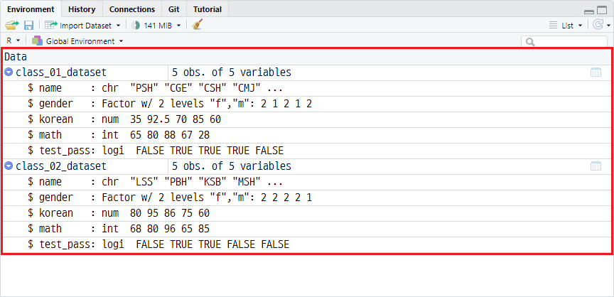 예시를 위해 이전 포스트인 <9. 데이터 구조 파악하기>의 데이터셋을 변형하여 1반, 2반 학생 데이터셋인 class_01_dataset, class_02_dataset을 정의하겠습니다.