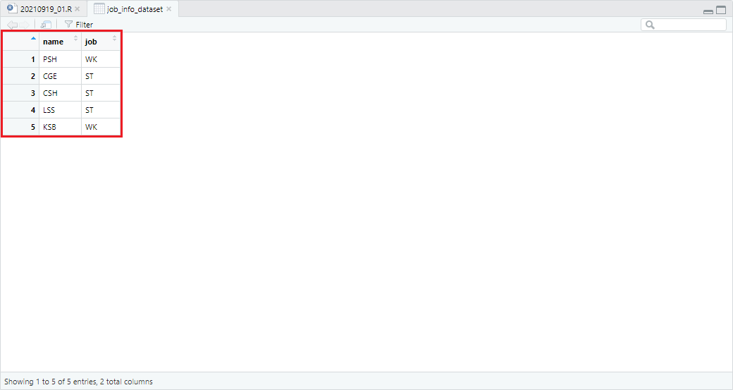 job_info_dataset <- data.frame(name = c("PSH", "CGE", "CSH", "LSS", "KSB"),
