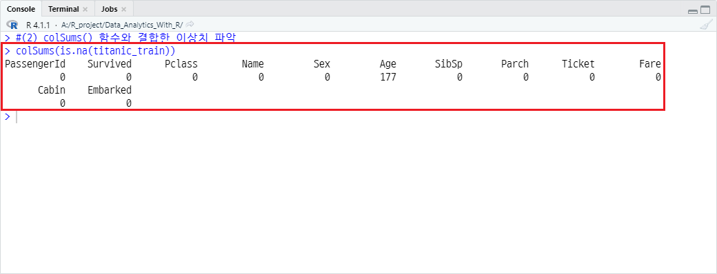 is.na() 함수는 객체의 원소가 결측치인지 논리형으로 반환하는 함수입니다. 단독으로 사용하기엔 시안성에 문제가 있어, 주로 colSums() 함수와 함께 사용합니다. titanic_train에서 결측치가 몇 개 있는지 파악하고자한다면 코드는 다음과 같습니다.