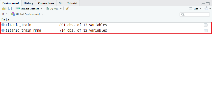 na.omit() 함수를 이용한다면, 데이터셋에 결측치가 존재하는 행(표본)을 제거할 수 있습니다. 아주 간단한 방법이나 데이터셋의 행 수가 적어진다는 단점이 있습니다. titanic_train에서 존재하는 결측값 177개를 제거하여 새로운 객체 titanic_train_rmna에 할당하고자한다면 다음과 같습니다.