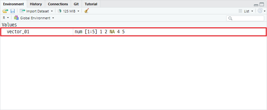 결측치는 데이터셋을 탐색할 때 발견되기도 하지만, 거꾸로 전처리를 위해 특정값들을 결측치로 처리할 때도 있습니다. 결측치를 생성할 때는 "NA"라는 입력을 통해 할당됩니다. 대소문자를 구분하니 유의하는게 좋습니다. 예를 들어 vector_01을 정의하면 다음과 같습니다.