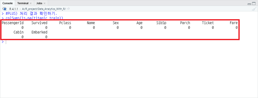 이후 처리 결과를 확인하면 다음과 같이 결측값이 없음을 확인할 수 있습니다.