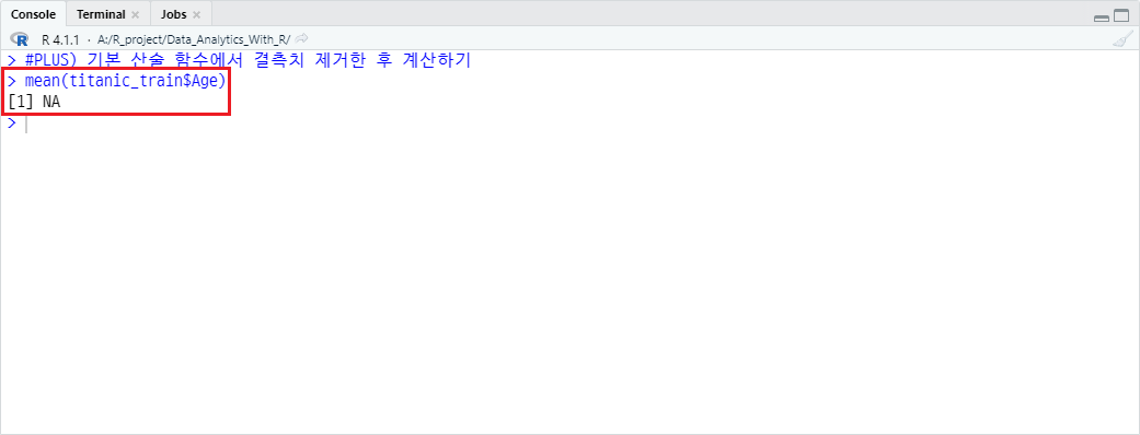 단, na.rm=TRUE 파라미터를 사용할 경우, 해당 결측치를 제거하여 계산함을 확인할 수 있습니다.