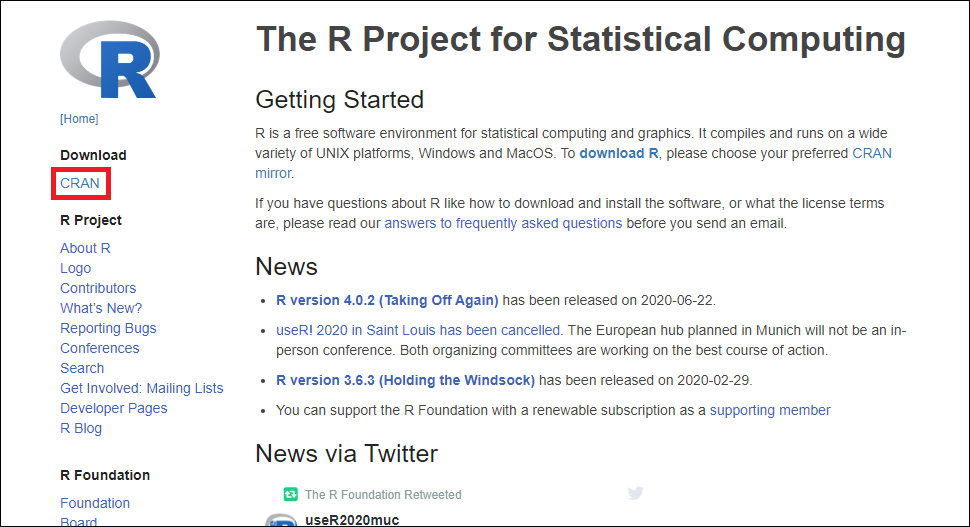 (1) R 공식 사이트인 <R-Project>에 접속해, 좌측하단 메뉴에 적혀있는 CRAN을 클릭합니다.