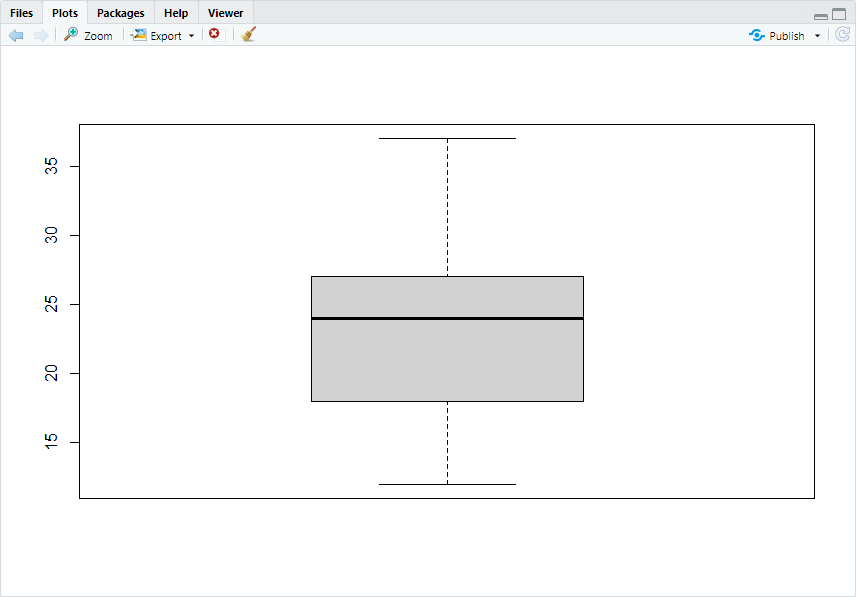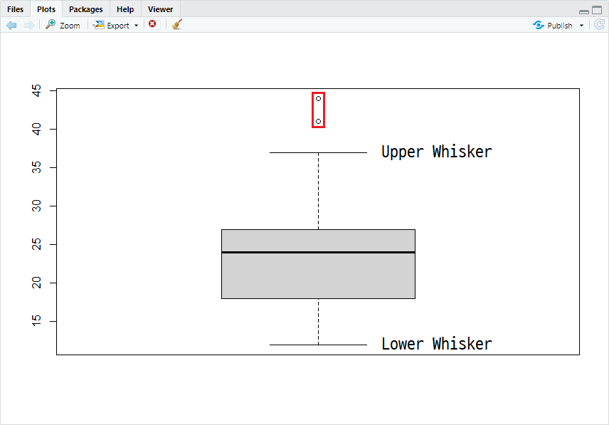 Boxplot이란, 데이터의 대략적인 분포와 사분위수범위(InterQuartile Range; IQR)을 이용해서 개별적인 이상치들을 동시에 보여줄 수 있는 그래프입니다. Boxplot에 대한 자세한 내용은 <link>에서 설명하겠습니다. mpg 데이터셋의 hwy에서 이상치를 판별하고자 할 때, boxplot() 함수의 속성인 stats를 이용하여 이상치를 식별하면 다음과 같습니다.