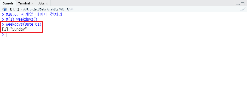 weekdays() 함수를 이용하여 해당 일수가 무슨 요일인지 출력할 수 있습니다. Date_01 객체의 날짜가 무슨 요일인지 파악하고자 할 때는 다음과 같습니다.