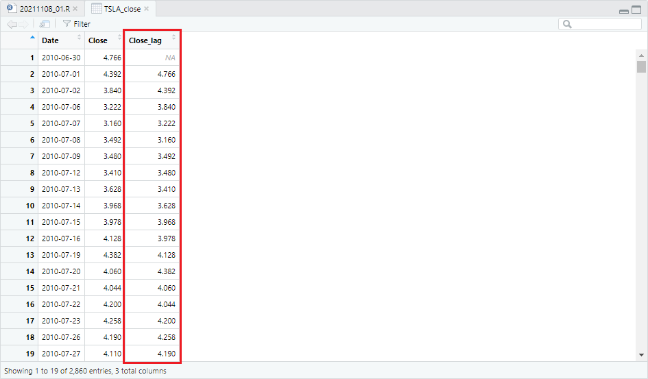 TSLA_close$Close_lag <- lag(x=TSLA_close$Close, k=1)