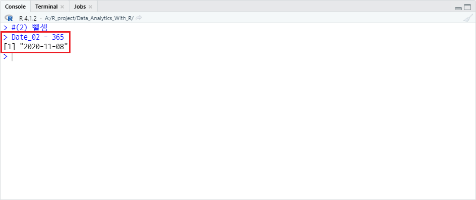 덧셈 연산과는 다르게, Date 객체와 Date 객체 간의 뺄셈 연산이 가능합니다. 뺄셈 연산은 -(minus sign)을 사용하거나 difftime() 함수를 사용하는데, Date_02와 Date_01 간의 일 수차이를 계산하고자 할때는 다음과 같습니다.