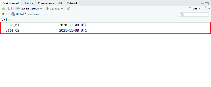 R에서는 POSIXct 객체 외에도, POSIXlt 객체가 존재합니다. POSIXct 객체는 1970년 이후의 일자를 초단위로 변환하여 정의된 벡터로 구성, POSIXlt 객체는 월, 일, 시, 분, 초, 타임존 등의 값을 리스트로 구성되어 있다는 차이점이 있습니다. 예시를 위해 2021년 11월 8일 15시 1분 24초의 날짜정보를 가지는 POSIXct_01객체와 POSIXlt_01 객체를 정의하겠습니다.