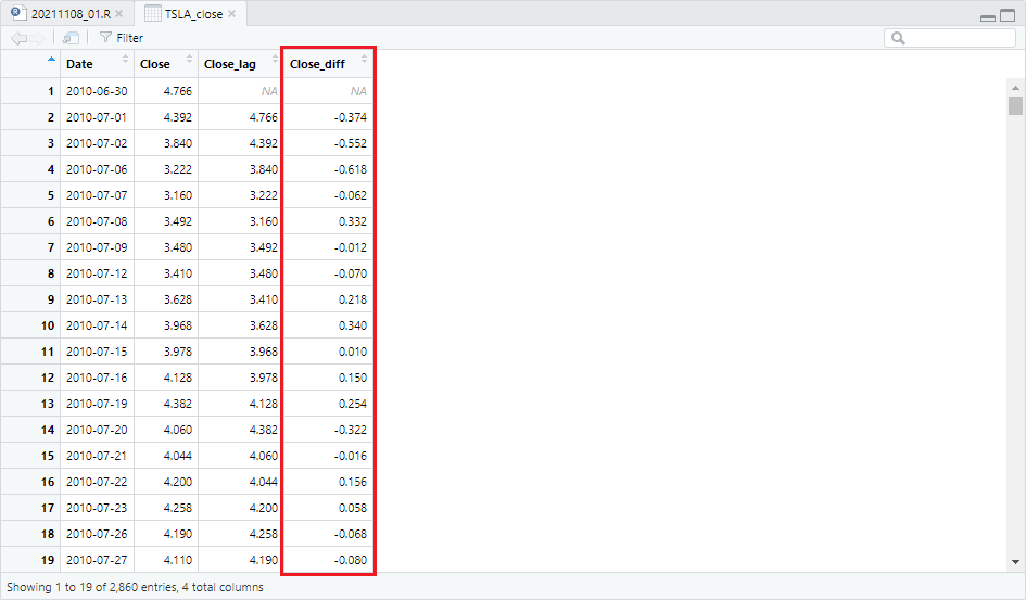 TSLA_close$Close_diff <- TSLA_close$Close - TSLA_close$Close_lag